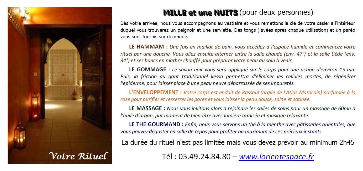 Dans notre SPA Oriental vous trouverez : rituels du hammam, gommage au savon noir, enveloppement au rassoul, massage relaxant, massage du monde, massage femme enceinte, massage enfant + parent, soins du visage à l'huile d'Argan, soins du corps, soins ou rituels en couple, soins ou rituels en DUO ou groupes ...