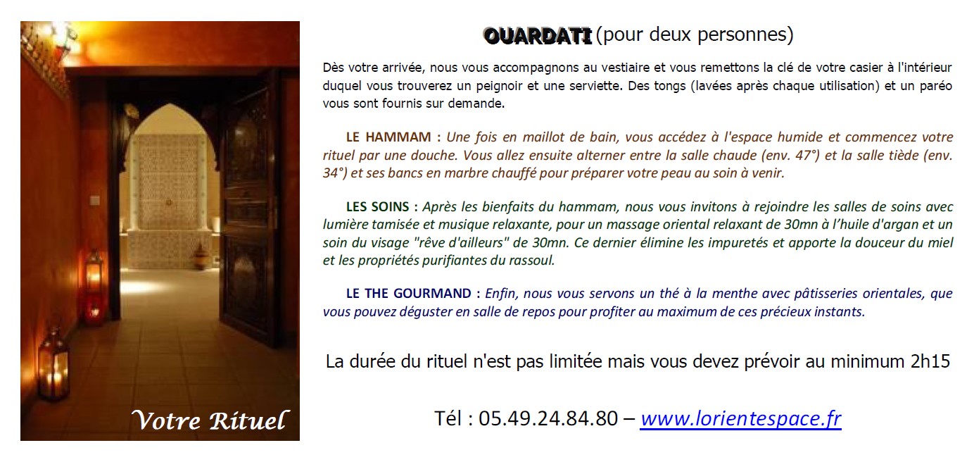 pour les 2 personnes : hammam + massage oriental relaxant de 30 mn + soin du visage "rêve d'ailleurs" de 30 mn + thé gourmand