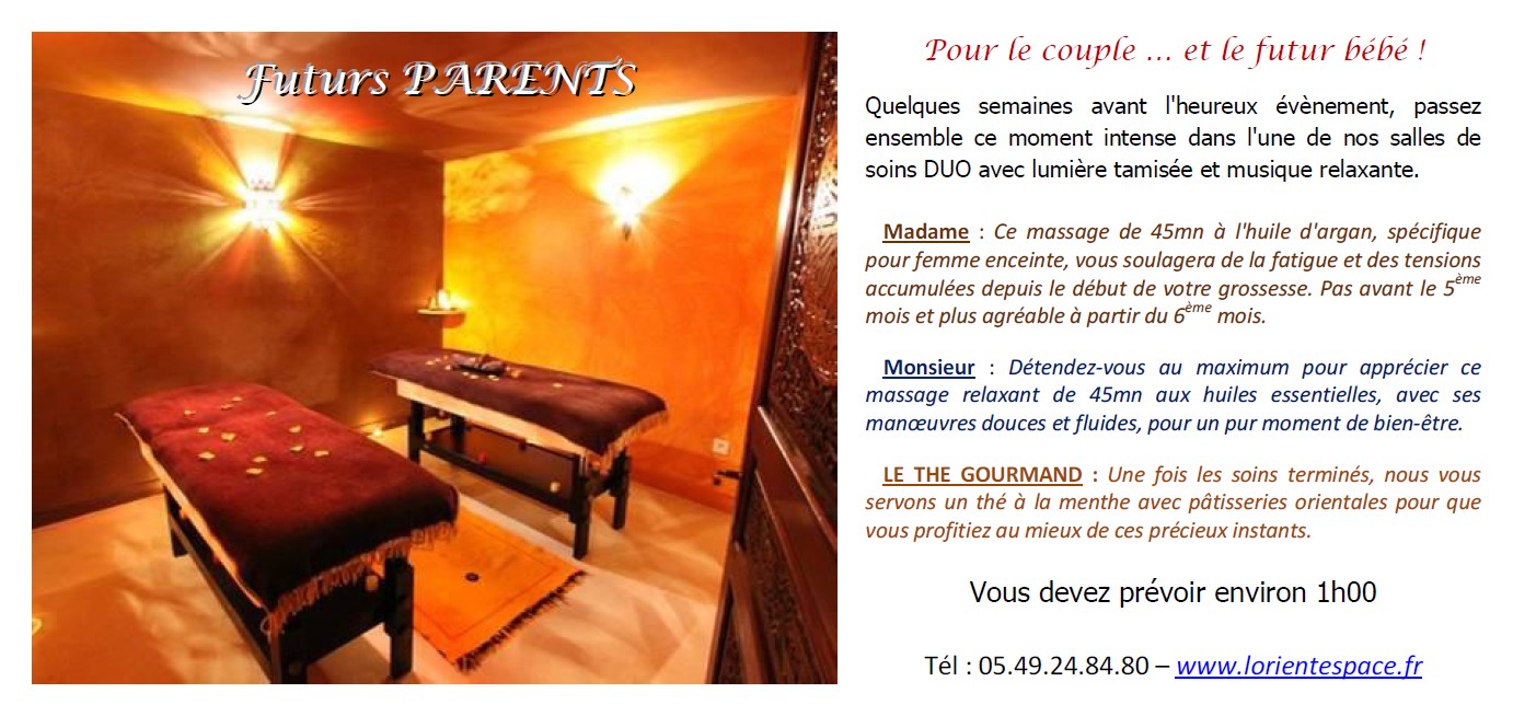 thé gourmand pour les 2 personnes + un massage femme enceinte de 45 mn pour la future maman et un massage oriental relaxant de 45 mn pour le futur papa