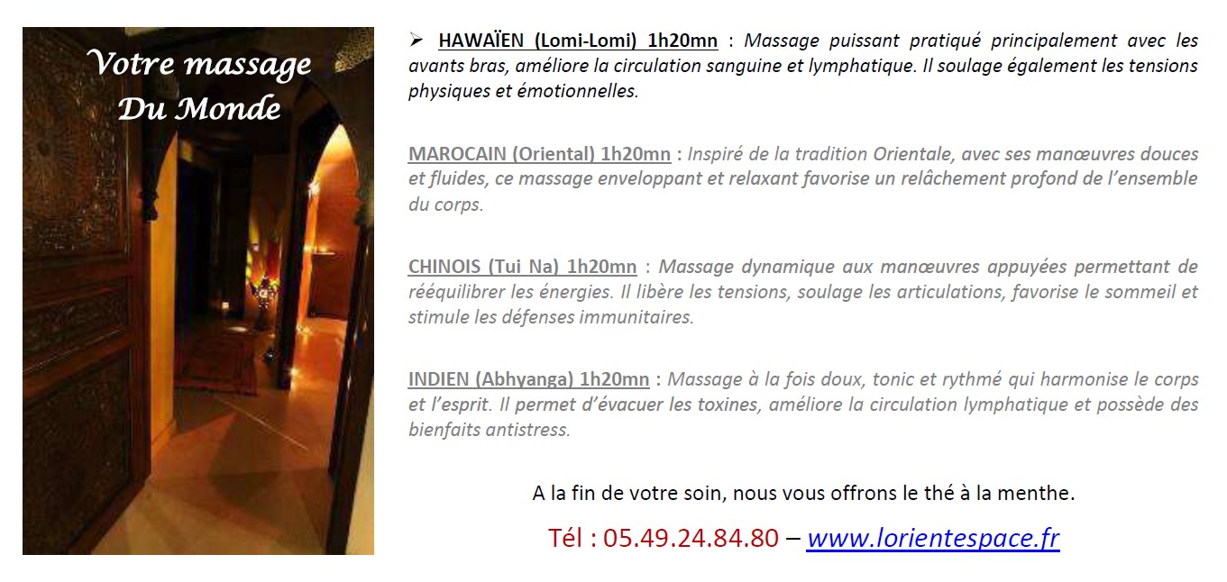 Dans notre SPA Oriental vous trouverez : rituels du hammam, gommage au savon noir, enveloppement au rassoul, massage relaxant, massage du monde, massage femme enceinte, massage enfant + parent, soins du visage à l'huile d'Argan, soins du corps, soins ou rituels en couple, soins ou rituels en DUO ou groupes ...