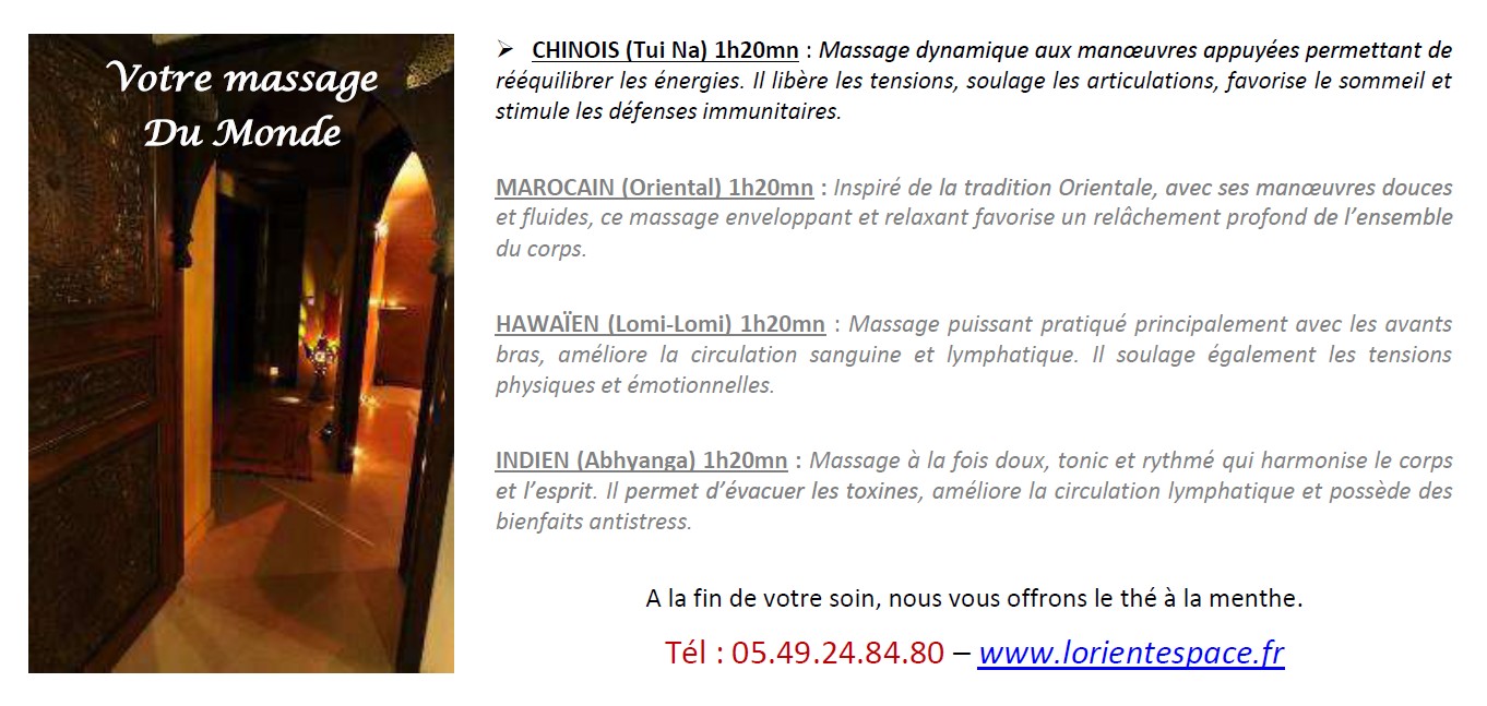 Dans notre SPA Oriental vous trouverez : rituels du hammam, gommage au savon noir, enveloppement au rassoul, massage relaxant, massage du monde, massage femme enceinte, massage enfant + parent, soins du visage à l'huile d'Argan, soins du corps, soins ou rituels en couple, soins ou rituels en DUO ou groupes ...