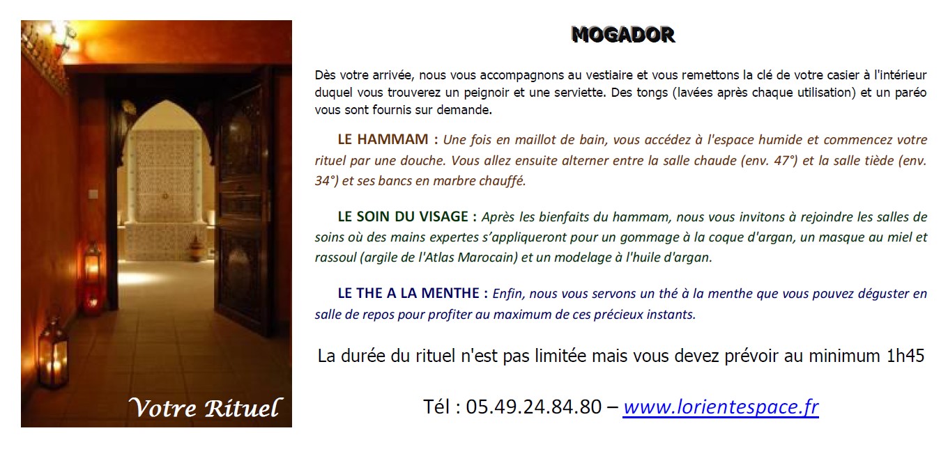 Dans notre SPA Oriental vous trouverez : rituels du hammam, gommage au savon noir, enveloppement au rassoul, massage relaxant, massage du monde, massage femme enceinte, massage enfant + parent, soins du visage à l'huile d'Argan, soins du corps, soins ou rituels en couple, soins ou rituels en DUO ou groupes ...