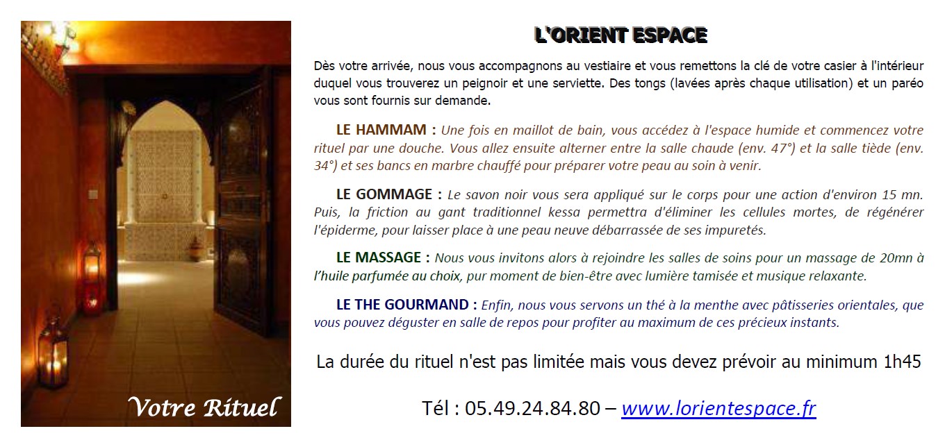 Dans notre SPA Oriental vous trouverez : rituels du hammam, gommage au savon noir, enveloppement au rassoul, massage relaxant, massage du monde, massage femme enceinte, massage enfant + parent, soins du visage à l'huile d'Argan, soins du corps, soins ou rituels en couple, soins ou rituels en DUO ou groupes ...