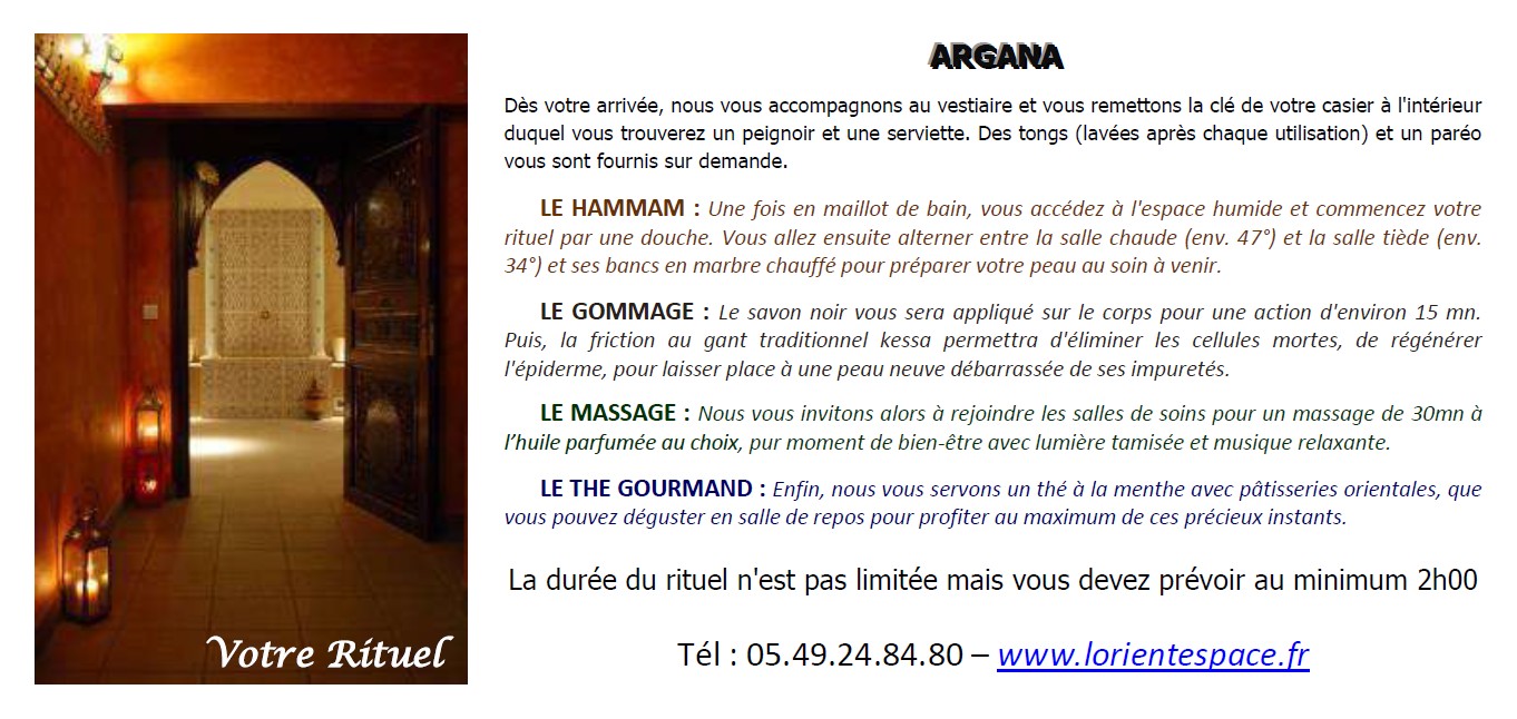 Dans notre SPA Oriental vous trouverez : rituels du hammam, gommage au savon noir, enveloppement au rassoul, massage relaxant, massage du monde, massage femme enceinte, massage enfant + parent, soins du visage à l'huile d'Argan, soins du corps, soins ou rituels en couple, soins ou rituels en DUO ou groupes ...