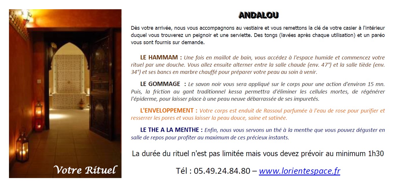 Dans notre SPA Oriental vous trouverez : rituels du hammam, gommage au savon noir, enveloppement au rassoul, massage relaxant, massage du monde, massage femme enceinte, massage enfant + parent, soins du visage à l'huile d'Argan, soins du corps, soins ou rituels en couple, soins ou rituels en DUO ou groupes ...