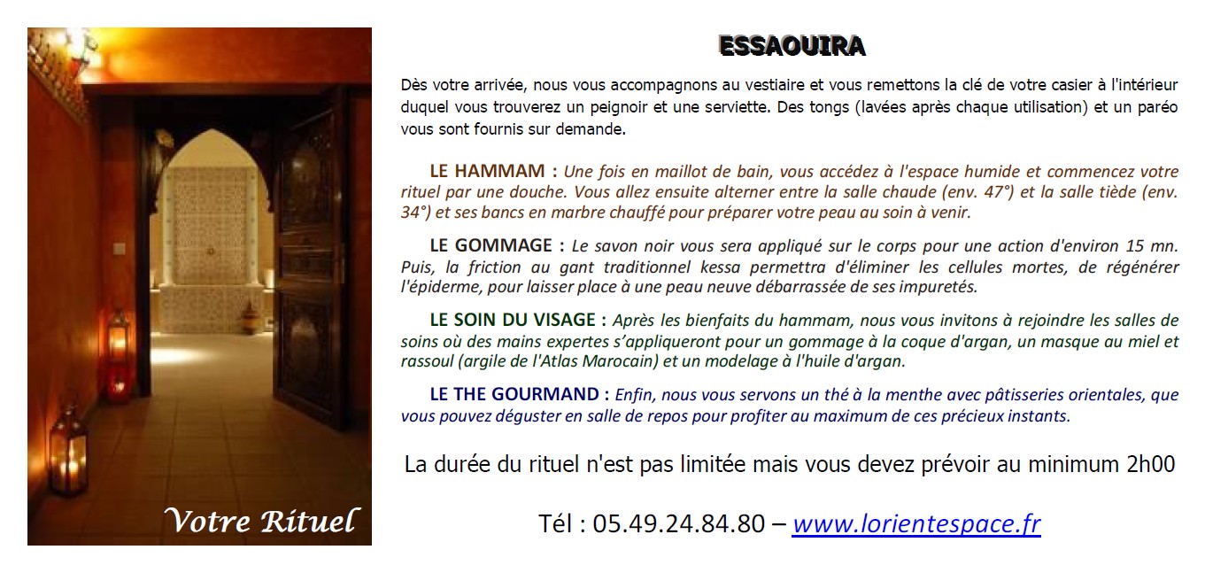 Dans notre SPA Oriental vous trouverez : rituels du hammam, gommage au savon noir, enveloppement au rassoul, massage relaxant, massage du monde, massage femme enceinte, massage enfant + parent, soins du visage à l'huile d'Argan, soins du corps, soins ou rituels en couple, soins ou rituels en DUO ou groupes ...