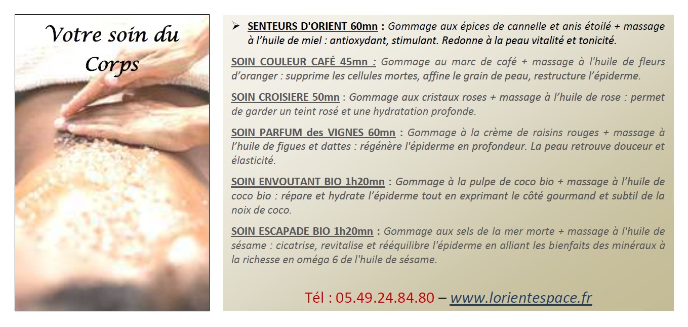 gommage aux épices de cannelle et anis étoilé + massage à l’huile de miel : antioxydant, stimulant. Redonne à la peau vitalité et tonicité.