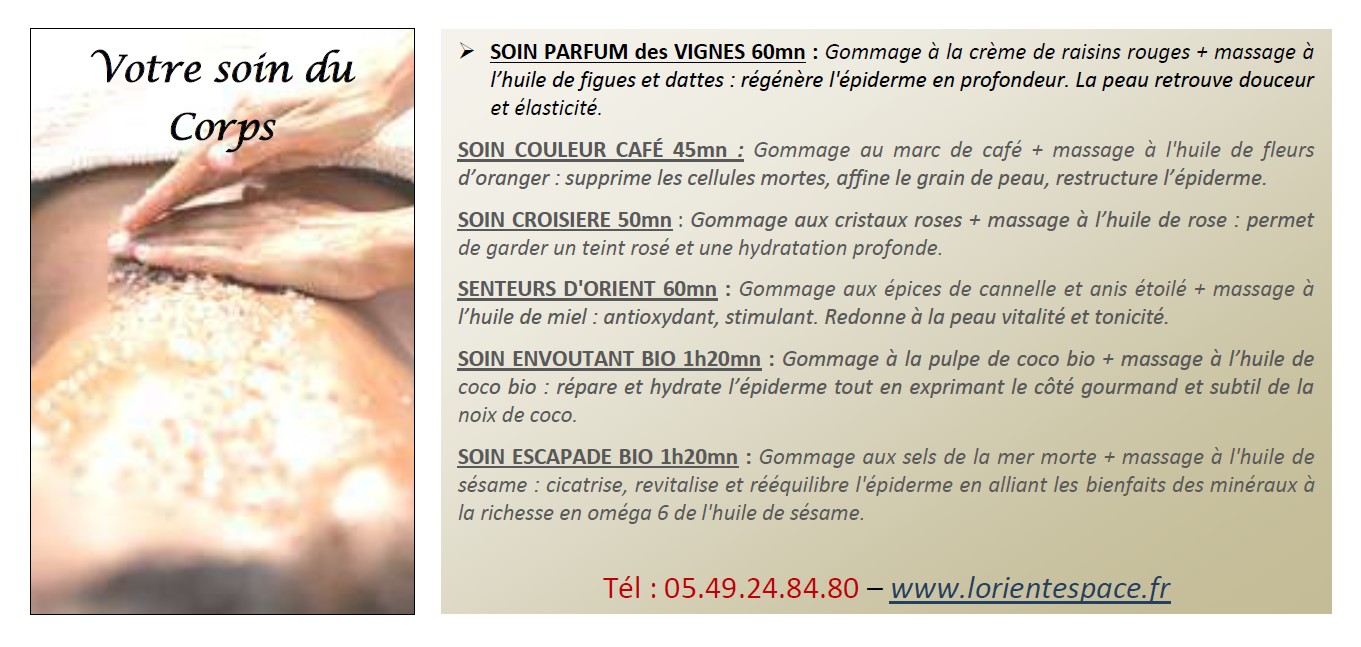 Dans notre SPA Oriental vous trouverez : rituels du hammam, gommage au savon noir, enveloppement au rassoul, massage relaxant, massage du monde, massage femme enceinte, massage enfant + parent, soins du visage à l'huile d'Argan, soins du corps, soins ou rituels en couple, soins ou rituels en DUO ou groupes ...